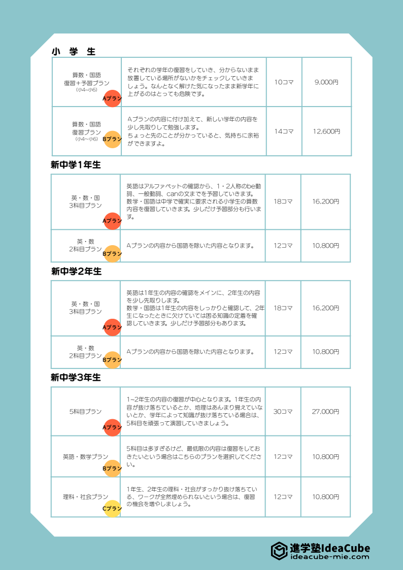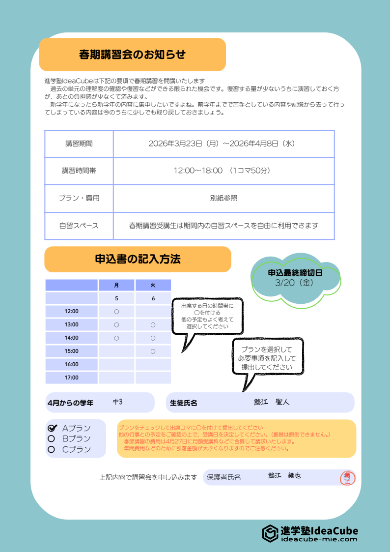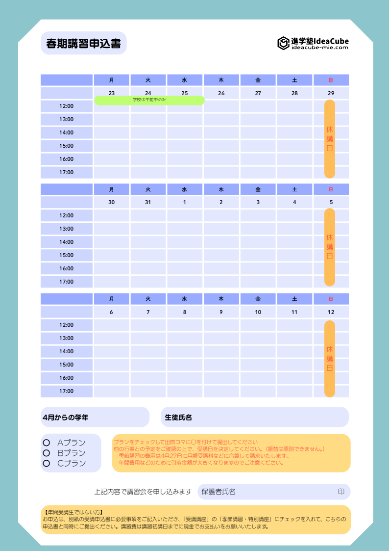 春期講習募集中 春期講習受講生募集中 春期講習を下記の要綱で実施いたします。 申し込み締め切り日を超えても授業コマを春期講習日程内に消化できるのであれば、受講の受付を行いますので、最後まで迷っている場合でもお問い合わせください。 申込書は校舎入り口のインフォポストにもおいてありますので、ご自由にお取りください。 お問い合わせ